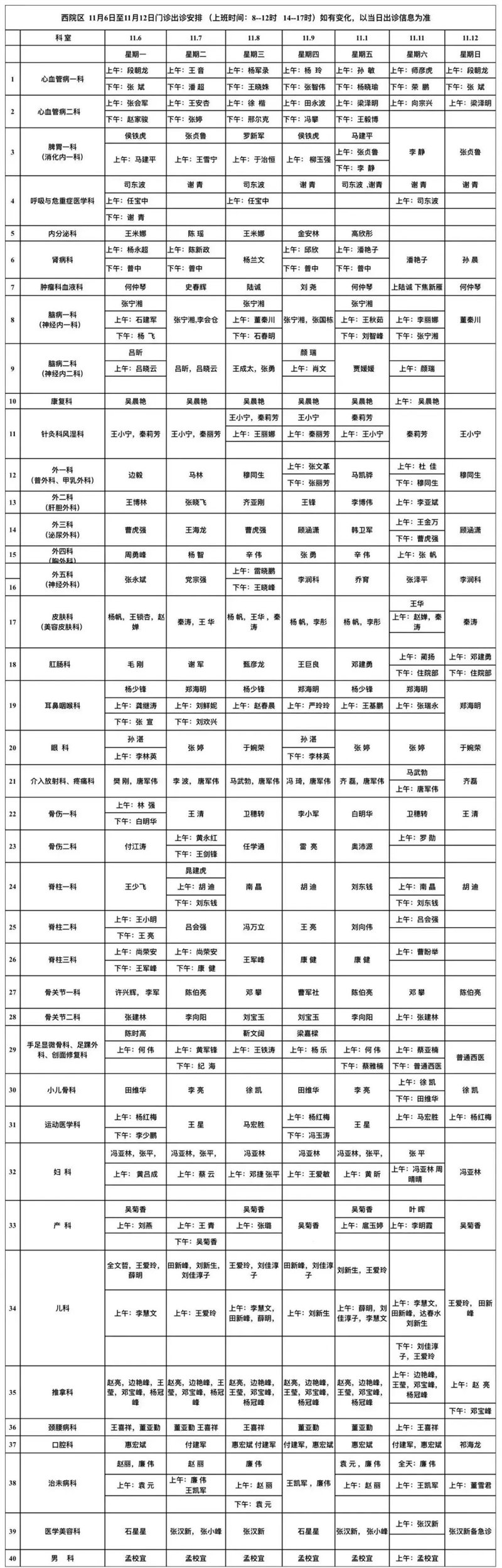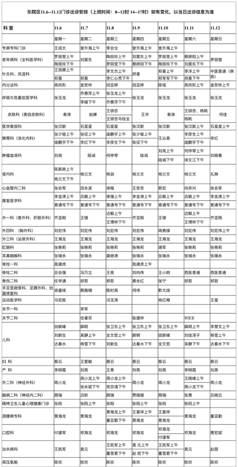 现发布2023年11月6日至11月12日两院区门诊出诊专家信息一览表,您可根据个人就诊需求,预约挂号就诊。实际出诊信息以“智慧服务平台”发布为准。